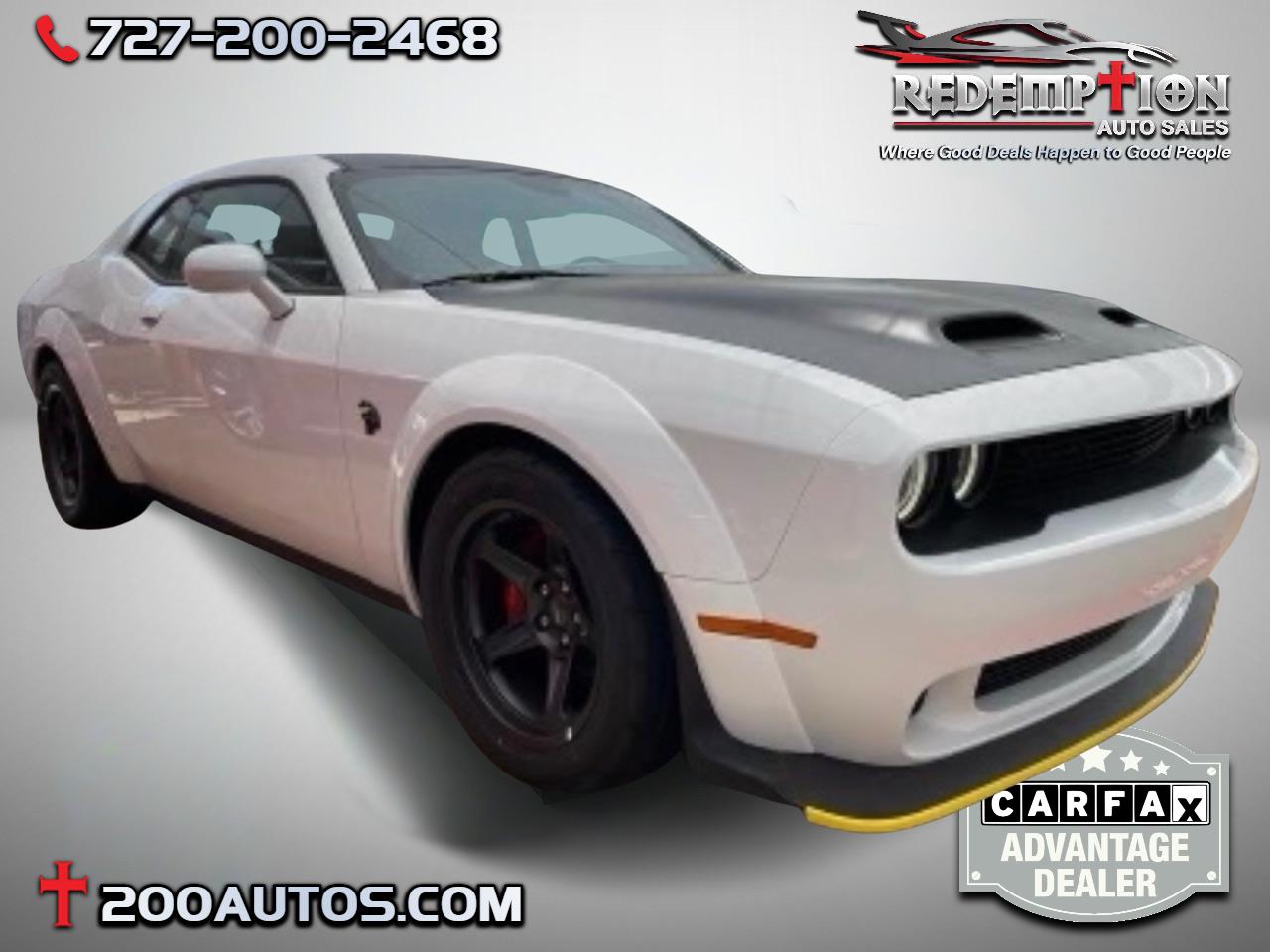 Recent Arrival! White 2023 Dodge Challenger SRT Hellcat 6.2L 8-Cylinder SMPI Supercharged OHV 8-Speed Automatic RWD***JAILBREAK SUPERSTOCK LAST CALL WIDEBODY*** ***RARE RARE RARE*** ***ONLY 100 MILES*** ***5 YEAR BUMPER TO BUMPER TRANSFERABLE WARRARTY AVAILABLE*** ***PROVIDED WITH EVERY PURCHASE*** ***CARFAX CERTIFIED DEALER*** ***BUY WITH CONFIDENCE FROM YOUR TRUSTED, LOCAL, FAMILY OWNED DEALER*** ***ON-SITE FINANCING AVAILABLE WHILE YOU WAIT*** Recent Oil Change, New Tires, 1 Year NMCA/NHRA Membership, 18 Speakers Premium Audio System, 1-Yr SiriusXM Guardian Trial, 220 MPH Primary Speedometer, 3.09 Rear Axle Ratio (DISC), 4G LTE Wi-Fi Hot Spot, 4-Wheel Disc Brakes, 5-Year SiriusXM Traffic Service, 5-Year SiriusXM Travel Link Service, 8.4" Touchscreen Display, Adaptive Speed Control, Adaptive suspension, All Radio Equipped Vehicles, All VP4R Radios, AM/FM radio: SiriusXM, Anti-whiplash front head restraints, Apple CarPlay, Apple CarPlay/Android Auto, Auto High Beam Headlamp Control, Auto Leather Wrapped Shift Knob, AutoStick Automatic Transmission, Black Seat Belts, Blind Spot & Cross Path Detection, Body Color Exterior Mirrors, Brembo 4-Piston Fixed Caliper Brakes, Bumpers: body-color, Compass Gauge, Dark Engine Turn Interior Accents, Delay-off headlights, Driver Convenience Group, Exterior Mirrors w/Heating Element, For Details, Visit DriveUconnect.com, For More Info, Call 800-643-2112, Forward Collision Warning, Four wheel independent suspension, Front Bucket Seats, Front reading lights, Fully automatic headlights, Garage door transmitter, Google Android Auto, GPS Antenna Input, GPS Navigation, harman/kardon Audio Group w/Subwoofer, harman/kardon GreenEdge Amp, HD Radio, Heated door mirrors, Heated Front Seats, Heated front seats, Heated Steering Wheel, Heated steering wheel, Hellcat Logo Laguna Leather Seat, Hellcat Logo Nappa/Alcantara Seat, High Performance Engine Controller, High-Intensity Discharge Headlamps, Illuminated entry, Integrated Center Stack Radio, Integrated Voice Command w/Bluetooth, Jailbreak IP Badge, Laguna Leather Package (DISC), Leather Shift Knob, Media Hub (2 USB, AUX), Navigation System, Painted Black Satin Graphics Package (DISC), Painted Black Satin Hood (DISC), ParkView Rear Back-Up Camera, Plus Package (DISC), Power door mirrors, Power driver seat, Power Multi-Function Foldaway Mirrors, Power Sunroof, Power Tilt/Telescope Steering Column, Premium Laguna Door Trim Panel, Premium-Stitched Dash Panel, Quick Order Package 27S SRT Super Stock (DISC), Quick Order Pkg 27D Hellcat Redeye Widebody Jailbreak (DISC), Radio data system, Radio/Driver Seat/Mirrors Memory, Radio: Uconnect 4C Nav w/8.4" Display, Radio: Uconnect 4C w/8.4" Display, Rain Sensitive Windshield Wipers, Redeye Badging, Remote Start System, Satin Black Dodge Tail Lamp Badge, Satin Black Painted Roof (DISC), Security system, Shark Fin Antenna, SiriusXM Radio Service, SiriusXM Satellite Radio, SiriusXM Traffic Plus, SiriusXM Travel Link, Spoiler, Sport steering wheel, SRT Black Package (DISC), SRT Grille Badge, SRT Hellcat Logo Houndstooth Seats, SRT Power Chiller, Steering Wheel Mounted Shift Control, Suede Door Trim Panel w/Map Pocket, Super Stock Suspension, Surround Sound, Technology Group, Technology Group (DISC), Telescoping steering wheel, Tilt steering wheel, Traction control, Trip computer, Trunk Mounted Subwoofer, USB Host Flip, Ventilated Front Seats, Wheels: 18" x 11.0" Aluminum (DISC), Wheels: 20" x 11.0" Carbon Black Lightweight, Widebody Competition Suspension, Widebody Fender Flares.